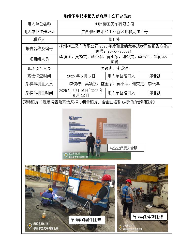 柳州柳工叉車有限公司2025年度職業(yè)病危害現(xiàn)狀評價報告