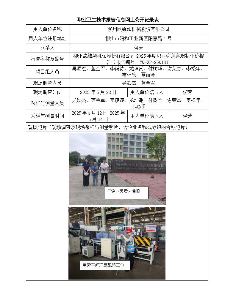 《柳州歐維姆機械股份有限公司2025年度職業(yè)病危害現(xiàn)狀評價報告》